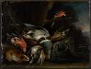Jagdstillleben mit toten Vögeln und Meerschweinchen vor Landschaft