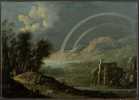 Flussgegend mit Ruine und doppeltem Regenbogen