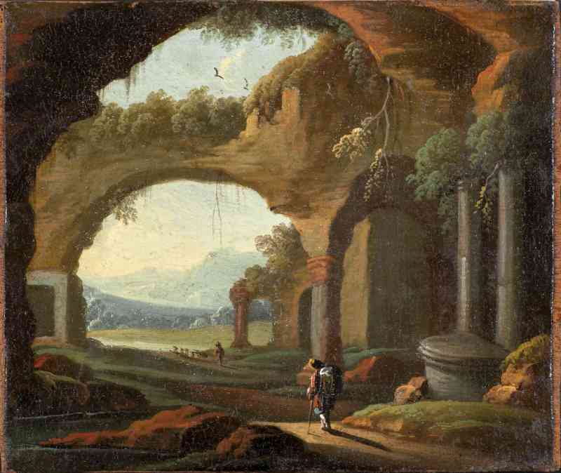 Die beiden Pendantgemälde bauen sich aus kulissenartig hintereinander gestaffelten Ruinen auf. Die Zuschreibung der beiden Bildchen an Abraham van Cuylenborch (um 1610–1658), wie sie von Ernst Friedrich Carl Prehn und David Passavant vorgenommen wurde, scheint zunächst naheliegend. Dieser Utrechter Maler war einer der berühmtesten Spezialisten für Grottendarstellungen, die wie hier mit antiken Sarkophagen und Standbildern gefüllt waren. Aber um wirkliche Grotten handelt es sich bei den Prehn’schen Bildern gar nicht, sondern um eine sonderbare Kombination aus Felshöhle und gebauter antiker Architektur. Auch fehlen die für Cuylenborch üblichen badenden Nymphen. Stattdessen sehen wir Reisende und Orientalen. Neben der kontrastreichen Wirkung von Licht und Schatten interessierte den Maler vor allem das Motiv der übereinander gestaffelten Durchblicke. Die Bildchen sind daher wahrscheinlich in Nürnberg entstanden, im Umkreis des aus Utrecht hier hergezogenen Willem van Bemmel (1630–1708).