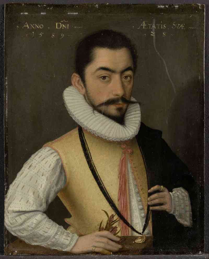 Auf Pr46 trägt der Dargestellte ein farbenfrohes Kostüm der spanischen Mode. Sein Gesicht erhält seine markanten Akzente durch die langen dunklen Augenbrauen, einen sehr breiten dünnen Schnurrbart und einen kurzen Spitzbart. Der Mann hält eine rote Blume in der rechten Hand und stützt diese auf einen Tisch. Hier liegt auch der goldene Anhänger auf, der ihm an einem langen schwarzen Band um den Hals hängt.
