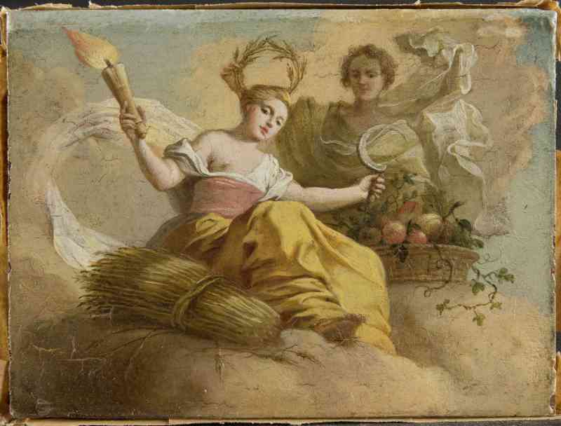 Der Reigen der vier Jahreszeiten wird in Pr281–Pr284 durch vier auf Wolken thronende Götter verbildlicht. Den Frühling charakterisiert Flora, leicht bekleidet in hellen, eher kühlen Farben. Ein nackter Putto schwebt mit einem breiten flachen Korb voll Blumen von links heran, während weitere bunte Blüten als Bukett zu Füßen der Göttin liegen. In warmen Farben ist Ceres als Personifikation des Sommers gehalten mit ihrem Rock in sattem Gelb und dem roten Mieder. In den ausgebreiteten Händen hält sie eine Fackel und eine Sichel. Bacchus, der Gott des Weines, steht für den Herbst. Das sich neigende Jahr wird durch einen dunkleren und von Abendrot überfluteten Himmel parallelisiert. Der ein von Äpfeln, Trauben und Weinranken überquellendes Füllhorn heranschleppende Putto wird von einem leuchtend roten Tuch umweht. Vor kühlen dunkel-blau-grauen Wolken sitzt schließlich der Windgott Aeolus auf seiner Wolke. Eine Böe bauscht seinen weiten blauen Mantel und als Zepter reckt er einen kahlen Zweig in die Höhe.