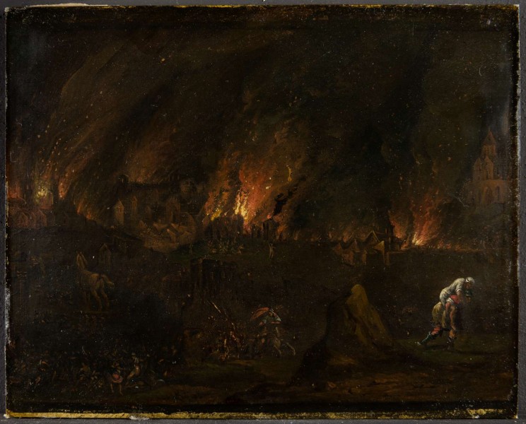 Die sehr dunkel gehaltene Nachtszene zeigt den Blick über eine ebene Landschaft oder Platzanlage, deren Hintergrund von einer Reihe brennender Gebäude besetzt ist. Im Mittelgrund ist links das Trojanische Pferd auszumachen, welches von schemenhaften Soldaten umgeben ist, während mittig ein Reiter nach vorne galoppiert und weiter rechts, getrennt durch einen Feldblock, Aeneas seinen Vater Anchises im Huckepack aus der brennenden Stadt trägt.