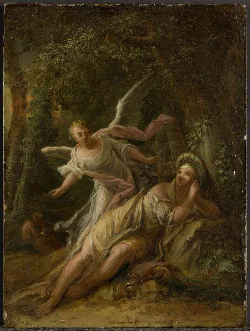 Das Gemälde zeigt die alttestamentarische Geschichte von Abraham und seiner Dienstmarkt Hagar. Da Abrahams Frau Sara kinderlos blieb, führte diese Hagar ihrem Mann zu, die daraufhin Ismael gebar. Als Sara Jahre später selbst ein Kind bekam, drängte sie darauf, Hager und Ismael in die Wüste zu schicken. Als Hagars mitgenommene Vorräte zu Ende gingen, drohte Ismael zu verdursten, doch es erschien ein Engel und zeigte ihr einen rettenden Brunnen (Gen 21,15–19).