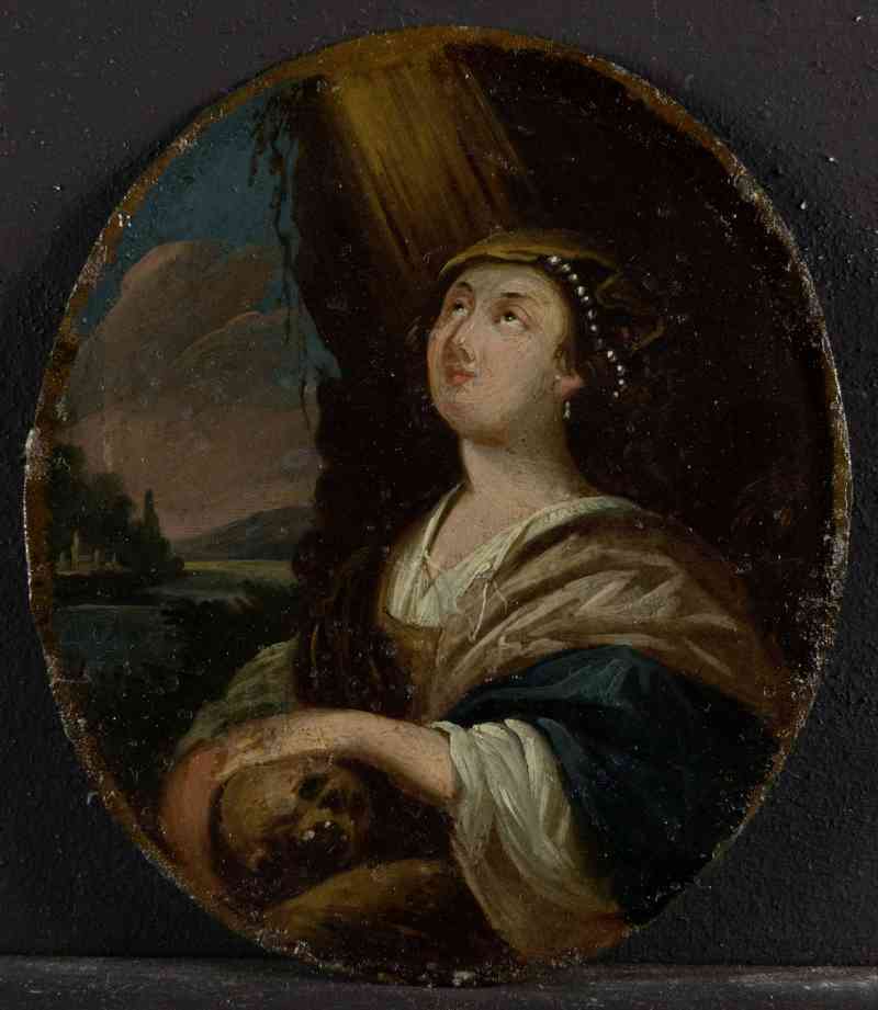 Der Totenschädel in Maria Magdalenas Schoß weist die ehemalige Sünderin nach der vorherrschenden Ikonographie der Renaissance und des Barock als Büßerin aus. Der unbekannte Künstler verzichtet jedoch sowohl auf eine extrem asketische als auch auf die weit verbreitete freizügige und damit stark erotisch konnotierte Darstellung der Einsiedlerin.