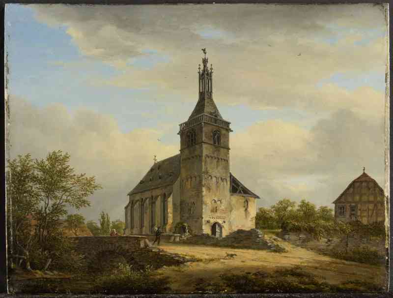 Das kleine Landschaftsgemälde lässt den Betrachter auf eine mittelalterliche Kirche in dörflicher Umgebung blicken. Dabei führt ein sandbrauner Weg vom Vordergrund aus über eine Brücke und einen schmalen Bachgraben links in den Hintergrund. Dort erkennt man zwei Ziegeldächer hinter Baumkronen. Eine Frau und ein Mann auf der Brücke sowie ein nach vorn laufender Hund beleben den Dorfplatz. Rechts bildet ein zurückgesetztes, stattliches Fachwerkhaus den Abschluss der Komposition. Bei der Kirche handelt es sich um St. Peter und Paul in Münster bei Bingen (heute Münster-Sarmsheim an der Nahe). Carl Morgenstern gibt dabei den Zustand des Gebäudes vor den Erweiterungen und Umbauten im Jahr 1895 und den Zerstörungen des Zweiten Weltkriegs mit großer Genauigkeit wieder. Er zeigt den romanischen, erstmals 1189 erwähnten Westturm sowie das 1511 aufgesetzte Glockengeschoss mit großen, mit Maßwerk gefüllten Arkaden. Auch der gelb-beigefarbene Anstrich des Putzes dürfte dem Baubefund um 1831 entsprochen haben und verleiht der Kirche ein vollkommen anderes Aussehen, als die heutige, sandsteinrote Fassung der Architekturglieder vor weißen Flächen.
