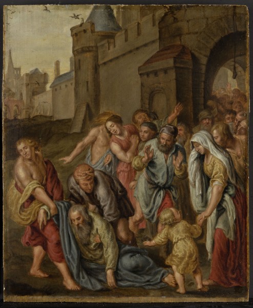 Im Gegensatz zu dem eindeutig benennbaren Bildgegenstand von Pr25, bleibt die Zuordnung des Gegenstückes fraglich. Aus dem Stadttor am rechten Bildrand ergießt sich der Strom einer bunten Menschenmenge in den Vordergrund. Hier ist ein älterer Mann mit langem Bart ohnmächtig niedergesunken. Zwei Männer versuchen ihm aufzuhelfen, während die übrigen Personen bestürzt zu dem auf den Boden liegenden herabblicken. Bei diesem handelt es sich vermutlich, trotz der zu Pr25 abweichenden Physiognomie, um Paulus. Möglicherweise ist hier der in der Apostelgeschichte geschilderte Moment dargestellt, in dem Jünger und Anhänger des Paulus diesen umringen und so vor weiteren Attacken schützen, nachdem er in Lystra gesteinigt und wie tot vor die Stadt geschleift worden war.