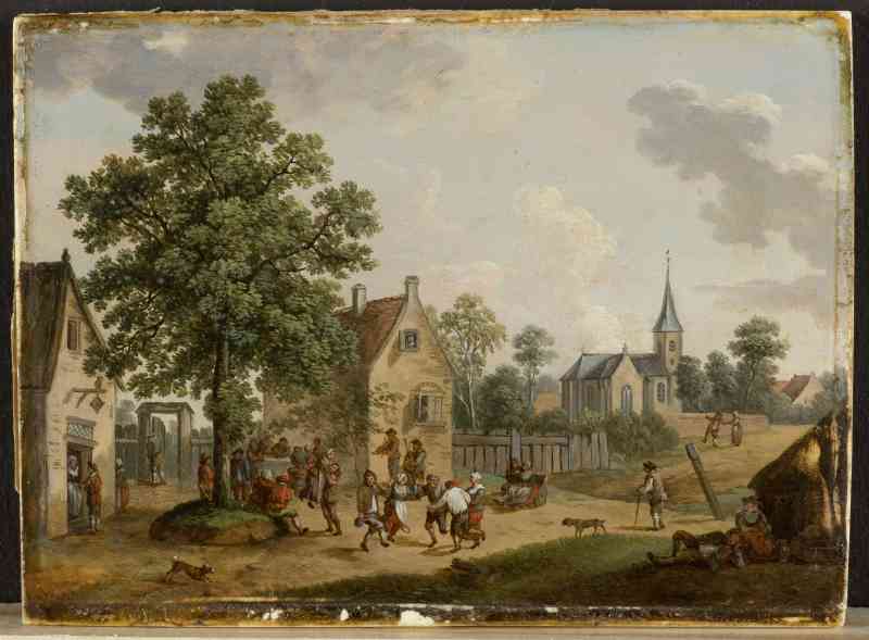 Gegenstand der Darstellung ist in beiden Fällen das fröhliche Treiben der Bauern bei einem Fest vor der Gastwirtschaft eines Dorfes. Ein großer Laubbaum ziert markant den Festplatz vor jedem Gasthaus. Auf Pr697 wächst er auf einer runden Erhöhung, die einem Liebespaar als Sitzbank dient. Es ruht möglicherweise vom Tanz aus, der vor ihnen zur Musik eines Geigers und eines Dudelsackspielers im vollen Gange ist: fünf Personen tanzen im offenen Kreis und ein Mann hebt seine Tanzpartnerin kraftvoll in die Höhe. Im Hintergrund an der Hausmauer wird um einen weiß gedeckten Tisch gegessen und getrunken. Im rechten Vordergrund ruht sich ein Paar mit seinen Trinkkrügen im Schatten eines strohgedeckten Schuppens aus. Auf Pr698 wird der Platz vor dem Gasthaus nach hinten und links von einem Holzzaun umschlossen. Ansonsten geht es hier etwas weniger wild zu: unter dem großen Baum im Hof ist ein Tisch aufgebaut, an dem Männer und Frauen schmausen.