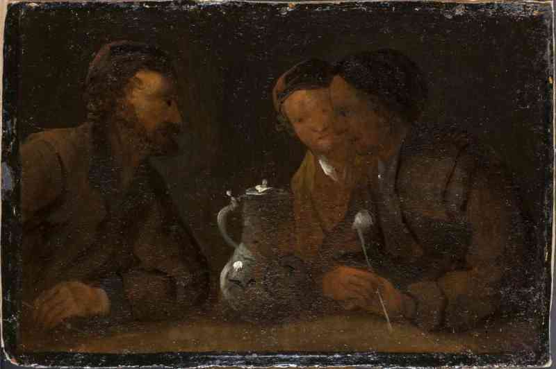 Drei Männer mit Tabakspfeifen bei einem Weinkrug