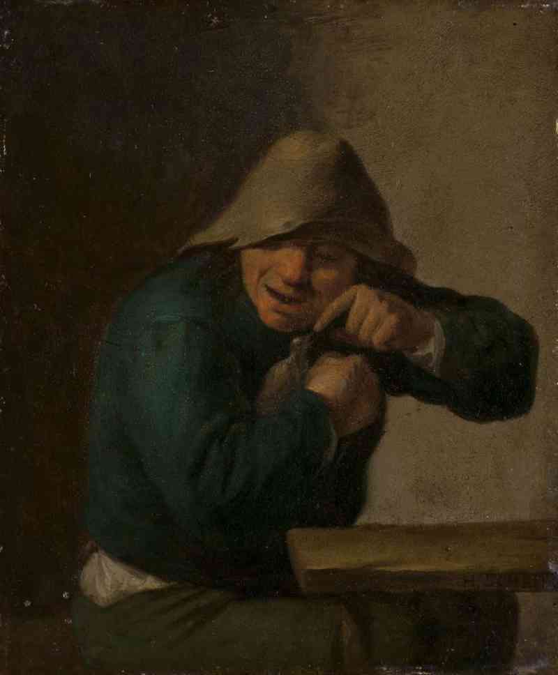 Das Bildchen wurde bislang dem Hamburger Maler Matthias Scheits (um 1630–1700) zugewiesen, obwohl die deutlich sichtbare Signatur auf der Tischkante den Vornamen mit „H.“ abkürzt. Die jüngste technische Untersuchung ergab zudem, dass nur das „S“ des Nachnamens original ist, der Rest wurde zu einem späteren Zeitpunkt ergänzt. Dementsprechend wundert es nicht, dass das Bildchen in seiner Malweise wenig mit den bekannten Arbeiten Scheits zu tun hat. Das Prehn’sche Täfelchen geht sehr viel mehr auf die ein- oder zweifigurigen Bauernstücke der flämischen Maler Adriaen Brouwer oder David Teniers d. J. (1610–1690) zurück. Hierfür sprechen sowohl die Bildanlage als auch der Gesichtstyp des Dargestellten und die gedeckte Tonskala.