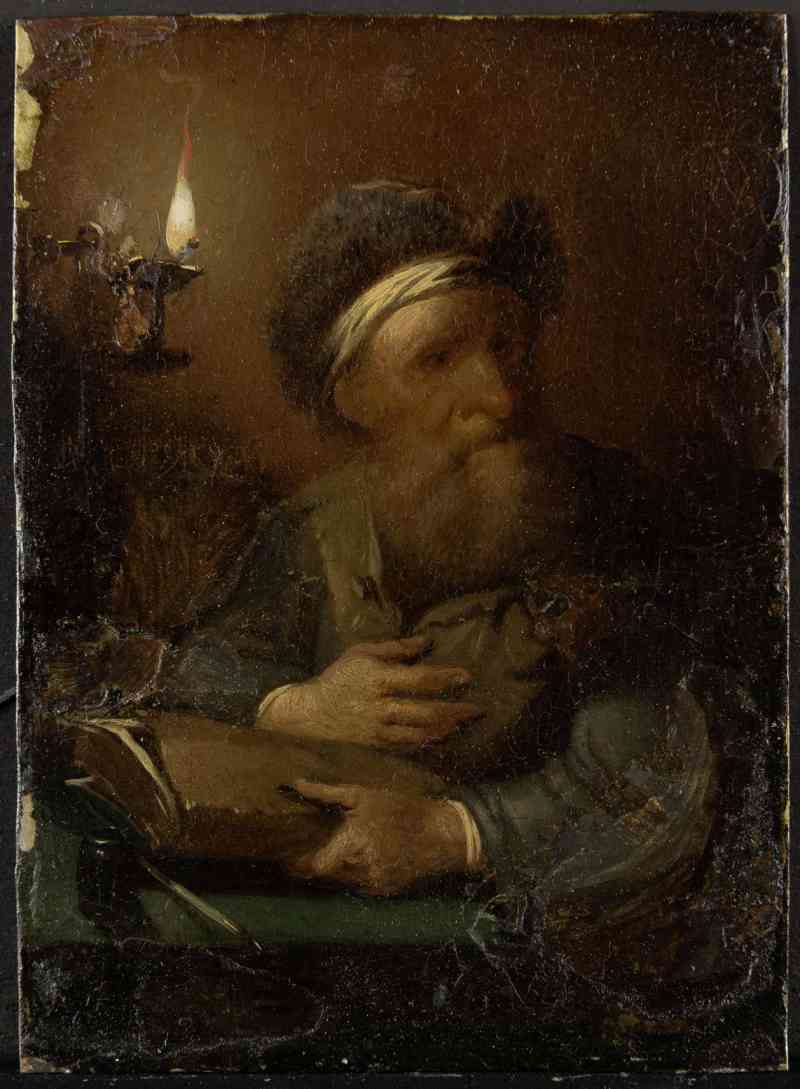 Zunächst erstaunt die tradierte Zuschreibung an Justus Juncker: Von diesem sind zwar nahansichtige Szenen mit lesenden oder schreibenden Alten in fensterlosen Studierstuben bekannt, doch werden diese nicht gerade als effektvoll beleuchtete Nachtszenen aufgefasst und stehen ebenso wenig dem Figurentypus des „tronie“ nahe. Juncker, dessen Schaffen mangels eines Werkverzeichnisses nur schwer zu überblicken ist, setzte sich jedoch ganz offensichtlich auch mit dieser, bei zeitgenössischen Kunstsammlern sehr beliebten Bildgattung auseinander. Hierauf lassen Kurzbeschreibungen in Auktionskatalogen des 18. Jahrhunderts schließen – und noch mehr jene Darstellungen bärtiger, alter Männer nach niederländischem Vorbild, die in einigen von Junckers sicher eigenhändigen, „zeitgenössischen“ Genreszenen als Wandschmuck zu erkennen sind. Vor diesem Hintergrund und auch da Malweise, Kolorit und Beleuchtung dem Personalstil Junckers sehr nahe stehen, erscheint die tradierte Zuschreibung beider Gelehrtendarstellungen durchaus plausibel.