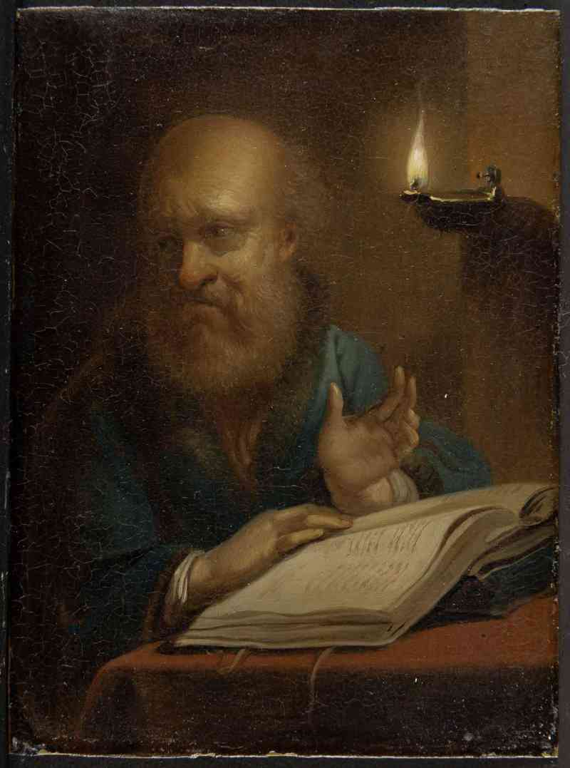 Zunächst erstaunt die tradierte Zuschreibung an Justus Juncker: Von diesem sind zwar nahansichtige Szenen mit lesenden oder schreibenden Alten in fensterlosen Studierstuben bekannt, doch werden diese nicht gerade als effektvoll beleuchtete Nachtszenen aufgefasst und stehen ebenso wenig dem Figurentypus des „tronie“ nahe. Juncker, dessen Schaffen mangels eines Werkverzeichnisses nur schwer zu überblicken ist, setzte sich jedoch ganz offensichtlich auch mit dieser, bei zeitgenössischen Kunstsammlern sehr beliebten Bildgattung auseinander. Hierauf lassen Kurzbeschreibungen in Auktionskatalogen des 18. Jahrhunderts schließen – und noch mehr jene Darstellungen bärtiger, alter Männer nach niederländischem Vorbild, die in einigen von Junckers sicher eigenhändigen, „zeitgenössischen“ Genreszenen als Wandschmuck zu erkennen sind. Vor diesem Hintergrund und auch da Malweise, Kolorit und Beleuchtung dem Personalstil Junckers sehr nahe stehen, erscheint die tradierte Zuschreibung beider Gelehrtendarstellungen durchaus plausibel.