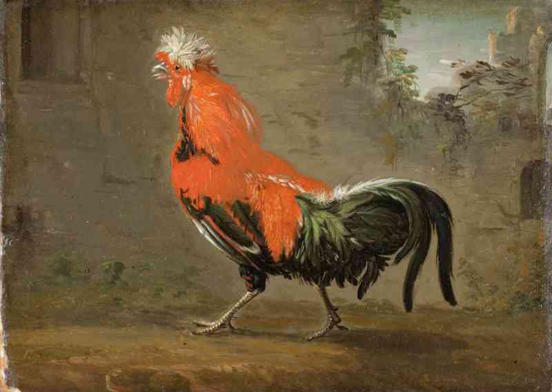 Dieses Tierbild geht zurück auf die zahlreichen Geflügelstücke der flämischen und holländischen Malerei, die von Spezialisten wie Melchior de Hondecoeter (1636–1695), Adriaen van Utrecht (1599–1653) oder David de Coninck (1644?–nach 1701) gefertigt wurden. Die meisten ihrer Kompositionen zeigen ganze Geflügelhöfe, deren Federvieh mit seinen Kämpfen, seinem Beglucken, seinem friedlichen Beisammenleben einen Spiegel der menschlichen Verhaltensweisen abgibt. Jedoch begegnen auch hier schon Darstellungen mit zurückgedrängtem erzählerischen Moment, die einen vereinzelten Hahn auf Augenhöhe zeigen.