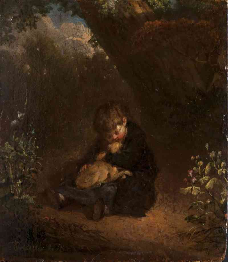 Kinderbilder scheinen im Oeuvre des zeitweilig in Frankfurt a. M. und Hanau tätigen Malers Georg Karl Urlaub einen recht großen Anteil ausgemacht zu haben (vgl. zu Urlaub die Militärbilder in der 2. Abteilung oder den Amor in der 25. Abteilung). Das vorliegende Bildchen zählt dabei sicher nicht zu seinen Meisterwerken, gibt uns aber eine gute Vorstellung von den beschaulichen und mit feinem Witz gewürzten Genrebildchen, die der stets um seine finanzielle Existenz kämpfende Maler für ein breites Publikum herstellte. Hier steht etwa die rührende Liebe des Kindes zu seinem Haustier mit der für den Hund völlig unbequemen Haltung im Kontrast und macht schmunzeln. Ist die Lesart der Jahreszahl 1803 richtig, muss es sich bei Pr814 um eines der letzten Werke des Künstlers handeln, der in diesem Jahr plötzlich erblindete.