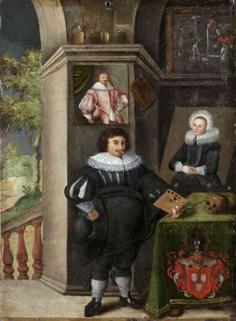 Das Ganzfigurenporträt zeigt einen vornehm gekleideten Maler in seinem recht herrschaftlichen Atelier. Offensichtlich handelt es sich um einen Porträtmaler, denn hinter ihm hängt ein ungerahmtes Herrenbildnis an der Wand, ein unvollendetes Damenbildnis steht noch auf der Staffelei. Der Maler stützt seine linke Hand, in der er Palette und Pinsel hält, auf einen Tisch. Auf dem grünen Tischtuch prangt stolz sein Wahlspruch „OMNIBVS PLACERE EST IN POSSIB[ILE]“ (Es allen Recht zu machen ist unmöglich) sowie sein Wappen. Dieses ist jedoch so allgemein gehalten, dass der Künstler bislang nicht identifiziert werden konnte: Die drei silbernen Schilde auf rotem Grund sind das heraldische Zeichen vieler Maler und Malergilden in Deutschland. Anhand der Kleidung und der modischen Accessoires ist das Bildchen in die Zeit um 1625 zu datieren.
