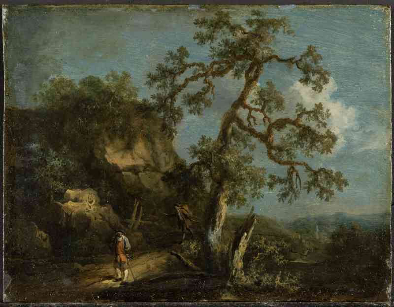 Zwischen einem strauchbewachsenen Felsen und einem knorrigen Baum auf der Mittelachse führt diagonal ein sandiger Weg ins Bild. Zwei männliche Reisende kommen hier mit nur leichtem Abstand hintereinander auf den Betrachter zu. Während der vordere ältere Mann den Betrachter zu fixieren scheint, schreitet der hintere kräftig vorwärts und hat den rechten Arm ausgestreckt.