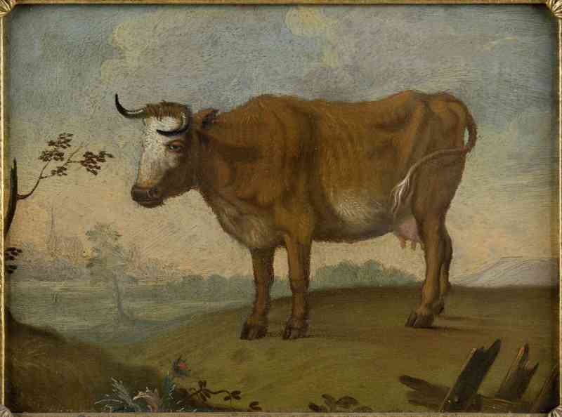 Die beiden Bildchen folgen dem Schema jener monumentalen Tierdarstellungen, das der Niederländer Paulus Potter mit seinem viel bewunderten Stier (1647) in Den Haag begründet hatte. Das Gemälde positioniert das Tier in ähnlicher, leichter Untersicht vor weiter Himmelsfläche, gruppiert jedoch noch weiteres Vieh und einen Hirten hinzu. In einigen späteren Kompositionen setzte Potter hingegen vereinzelte Tiere vor ebenso niedrige Landschaftsausblicke und einen weiten Himmel. Selbst in kleinen Formaten erreicht er somit eine eindrucksvolle Wirkung. Diese ist auch Potters Radierungen eigen, etwa der 1680 datierenden Serie Verschiedene Stiere und Kühe. Blatt eins und fünf dieser Arbeiten sind als direkte Vorlagen für die besprochenen Prehn’schen Gemälde nachweisbar. Der unbekannte Künstler kopierte dabei jeweils das Hauptmotiv sehr detailgetreu, stellte das Vieh jedoch in eine andere, neu erfundene Umgebung.