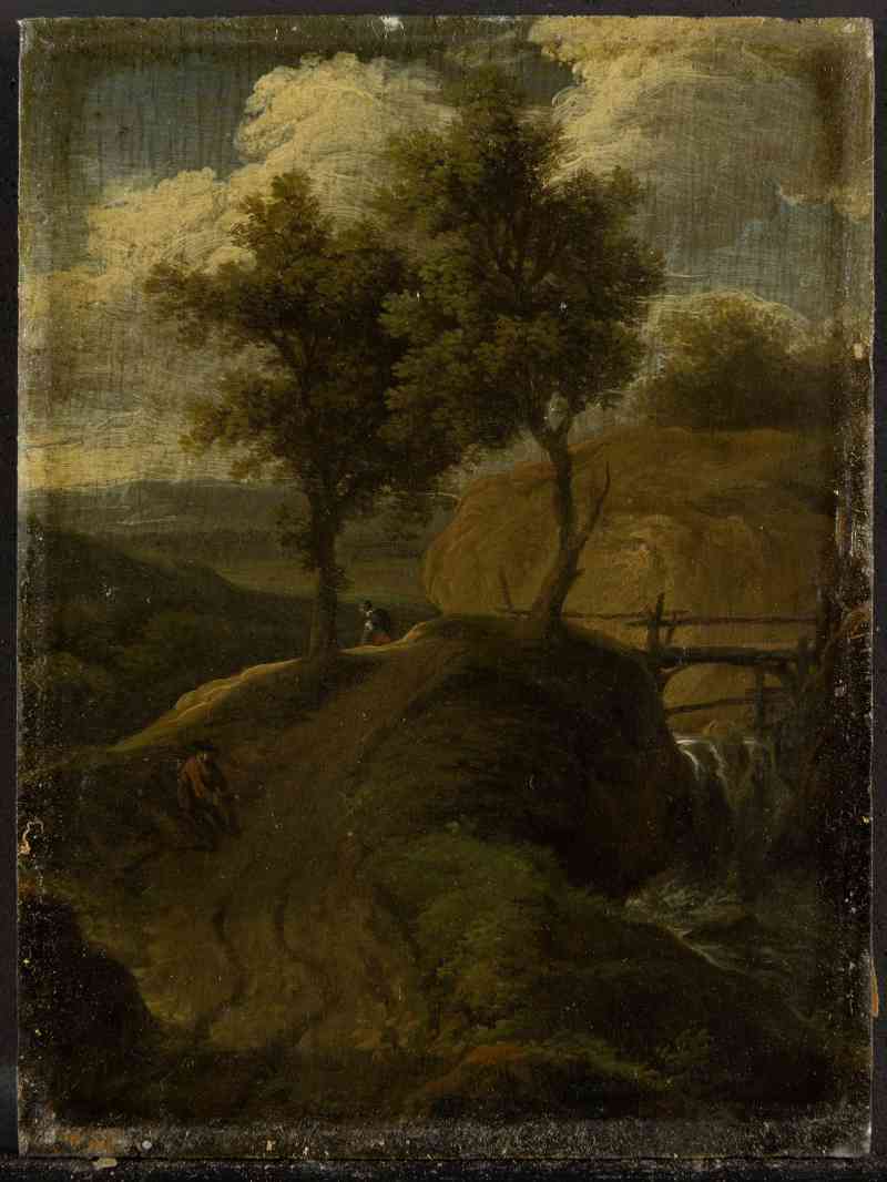 Auf dem Pendant kommt im Gegenzug das Licht von links und erhellt einen Streifen des schmalen Grades, auf dem der Weg ins Bild hineinführt. Zwei Reisende sitzen mit einigem Abstand am Wegesrand, der hintere von ihnen hat sich zwischen den Bäumen in der Sonne niedergelassen und lässt den Blick in die tieferliegende Landschaft schweifen. Die dunkeltonigen und in der Lichtbehandlung nicht durchgearbeiteten Bildchen sind Beispiel für das gesteigerte Interesse an der Darstellung einsamer und wilder Berggegenden in der zweiten Hälfte des 18. Jahrhunderts.