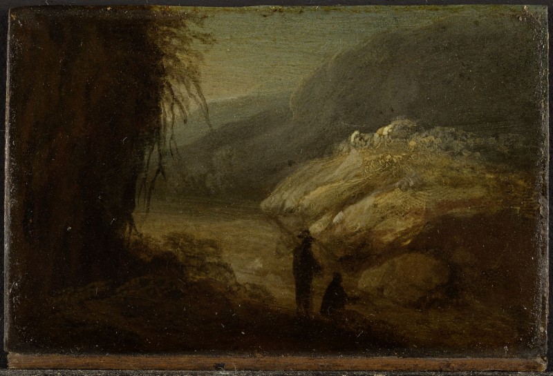 Die kleine Stimmungslandschaft in kühlen Braun-, Gelb- und Blautönen öffnet an der strauchbewachsenen Felswand vorbei den Blick in ein felsiges Tal. Durch dieses fließt ein Bach, an dessen Ufer sich zwei schemenhaft dargestellte Personen aufhalten. Eine der beiden Figuren sitzt und scheint mit beiden Händen etwas vor sich zu halten; die andere steht hinter ihr mit einem geschulterten Fischernetz am Stock. Eigentlicher Augenpunkt des Bildes ist jedoch der mächtige, von der Sonne erleuchtete Felsbrocken im rechten Mittelgrund, den der Künstler mit wildem Pinselduktus und pastosem Farbmaterial gestaltet hat. Der unbekannte Maler scheint noch ausprobierend die Farbschichten in expressiven Kringeln und Schraffuren übereinanderzulegen. Dadurch verklärt er die Felsform und -beschaffenheit eher als sie herauszuarbeiten. Für sich genommen, kann der Fels damit beinahe als abstraktes Gebilde angesehen werden und charakterisiert Pr753 eher als Studie denn als ausgereiftes Gemälde.
