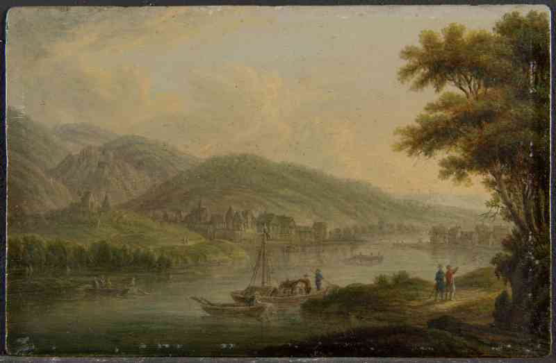 Das Landschaftsgemälde zeigt leicht modifiziert das rechte Rheinufer bei Neuwied mit Ansicht von Engers und Sayn. Als Repoussoirmotiv dieser Flusslandschaft dient ein von zwei Personen belebter Uferstreifen in der rechten unteren Ecke mit Böschung und hoch aufragenden Bäumen. Der breite Strom führt von links vorn nach rechts in die Tiefe. Mehrere Boote beleben die glatte Wasserfläche und schildern das arbeitsreiche Treiben der Fischer und Fährleute am Fluss. Vom rechten Ufer ist im Mittelgrund nur eine Landzunge mit dichter Besiedlung zu sehen, das jenseitige Ufer wird hingegen ausführlicher beschrieben: Hinter einem Auwald links erhebt sich auf einem flachen Hügel eine klosterartige Anlage, etwas weiter im Mittelgrund liegt ein Städtchen mit hohen Häusern und Kirchen direkt am Wasser. Überragt wird diese Uferzone von hohen Bergen, in deren Mitte eine mächtige Burganlage thront. Warmes Licht färbt die Wolken vor dem blauen Himmel golden.