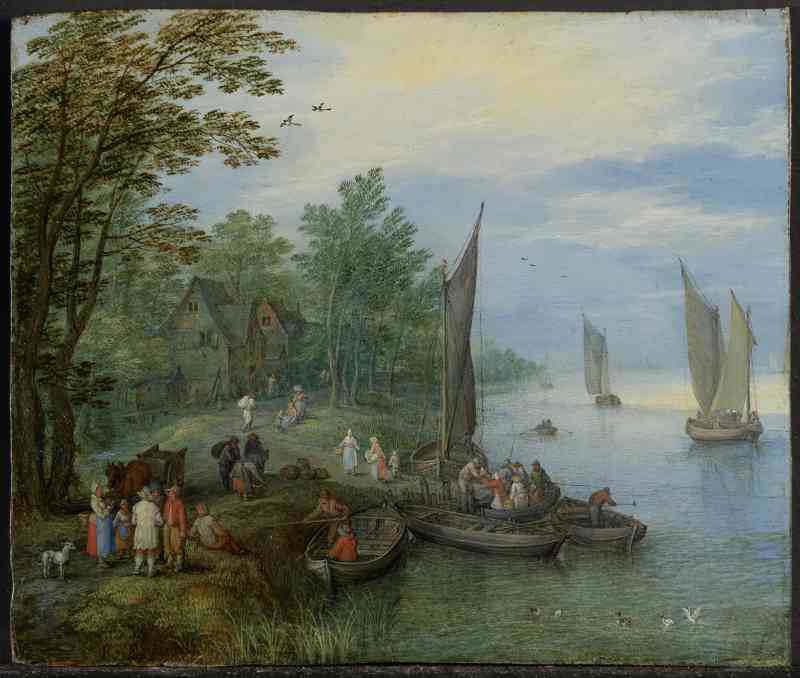 Im Œuvre Jan Brueghels d. Ä. nehmen die Flusslandschaften einen breiten Raum ein. Die wohl früheste Version, die ein bewaldetes und mit Häusern bestandenes Ufer samt Landesteg links einer Wasserfläche rechts gegenüberstellt, befindet sich heute im Rijksmuseum Amsterdam und stammt aus dem Jahr 1604.