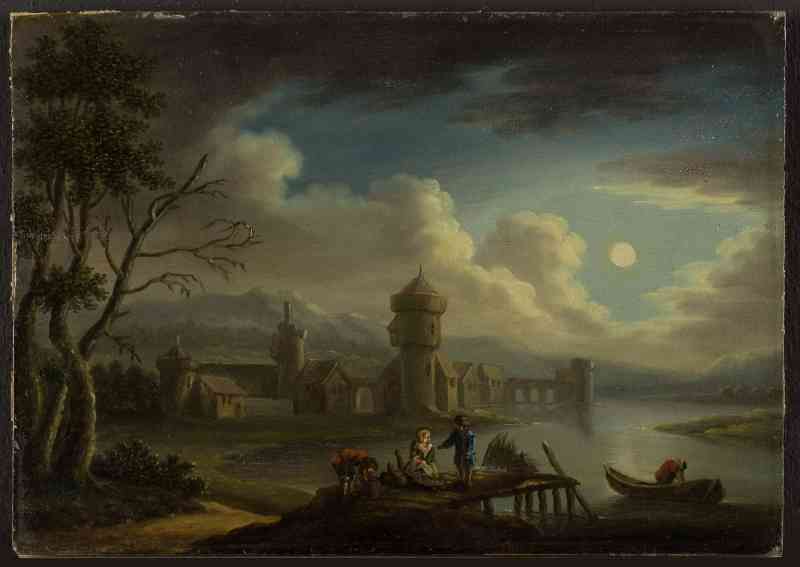 Eine nach der Phantasie komponierte Flusslandschaft erstreckt sich bis zum fernen Bergpanorama im Mondschein unter einem aufgerissenen Himmel. Die Wolken am oberen Bildrand sind drohend schwarz und flach, am Horizont hingegen bauschig und hell. Nach links wird das Bildfeld von drei hoch aufragenden Bäumen begrenzt, in der rechten Bildhälfte windet sich spiegelglatt der Fluss in die Tiefe. Ein Bötchen treibt hier im Vordergrund, in dem sich eine Figur mit dem Rücken zum Betrachter über die Bootswand lehnt. Mittig ragt ein hölzerner Steg ins Wasser auf dem sich drei Personen befinden. Über ihnen ragt als eigentlicher Blickpunkt des Bildes eine Ansammlung von Häusern und phantastischen Türmen mit Erkern und hölzernen Wehrgängen unter den flachen Kegeldächern am Flussufer auf. Eine Bogenbrücke mit drei Durchbrüchen führt zu einem im Fluss stehenden Turm, der sich im Wasser spiegelt.