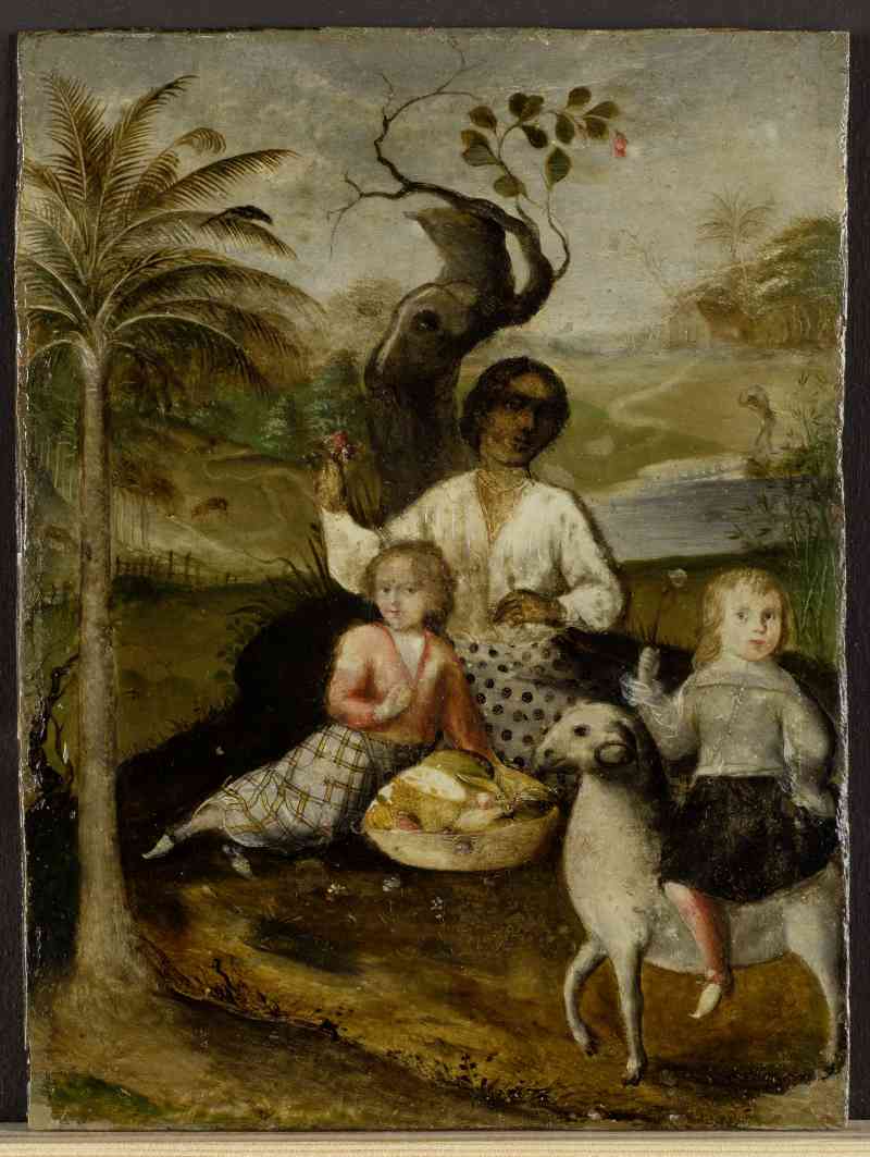 In einer außereuropäischen Landschaft sitzen eine dunkelhäutige Frau und ein kleines hellhäutiges Mädchen vor einem Baumstumpf. Vor ihnen ist eine obstgefüllte Schale platziert. Ein kleiner Junge reitet auf einem Böckchen von rechts in Bild. Den linken Bildrand begrenzt ein schlanker Palmenbaum und der Hintergrund zeigt links einige grasende Tiere. In einem Tümpel rechts trägt ein dunkelhäutiger, nur mit einem weißen Lendenschurz bekleideter Sklave mit gebeugtem Rücken eine schwere Last. Der Junge mit schulterlangem blondem Haar ist in ein taillenlanges graues Wams gekleidet, auf dem ein breiter Kragen liegt und dessen Ärmel geschlitzt sind. An seiner schwarzen Rockhose sind zahlreiche rote Bandschluppen befestigt. Diese Mode lässt sich anhand von Vergleichsbildern in die 1650er Jahre datieren. Die Kleidung des Mädchens ist hingegen nicht mehr authentisch: das gelbe Karomuster auf ihrem weißen Rock ist eine spätere Hinzufügung. Aufgrund des schlechten des Gemäldes sind weder die Blumen, die der kleine Junge und die Frau präsentieren, noch die exotisch aussehenden Früchte in dem Obstkorb genauer zu benennen.