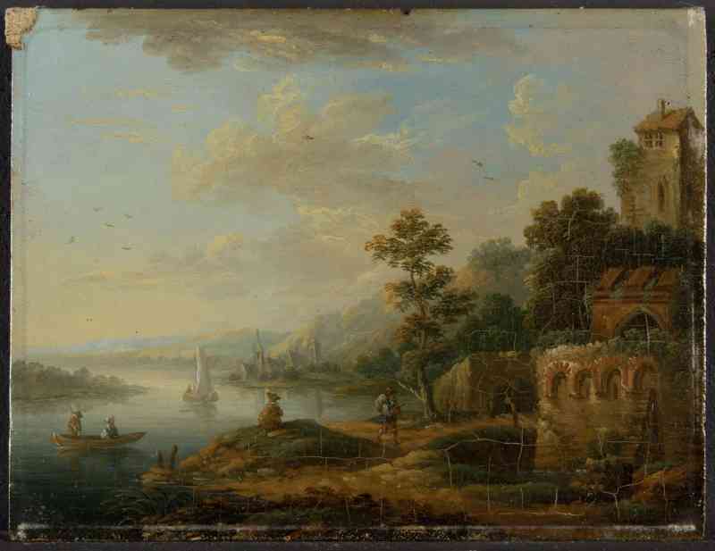Die beiden Bildchen zeigen zwei Ideale Flusslandschaften ganz in der Art von Christian Georg Schütz dem Älteren (1718-1791) und seines Kreises. In Pr755 erstreckt sich im Vordergrund ein Uferstreifen, besetzt mit zwei Staffagefiguren sowie einer Wehrmauer, hinter der sich einige Gebäude befinden. Auf der linken Seite führt ein breiter Flusslauf in den Hintergrund, der mir einer kleinen Stadt und im Dunst liegenden Höhenzügen staffiert ist. Das Gegenstück Pr790 zeigt eine entsprechende Landschaft in entgegen gesetzter Anordnung.