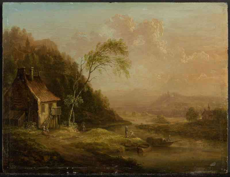 Die ideale, nach der Phantasie gebildete Landschaft liegt im Licht der untergehenden Sonne und ist durch einen Flusslauf in zwei verschiedene Hälften geteilt: Rechts schweift der Blick über Flussauen, ein einsames Haus am Bildrand und bewaldete Hügel in den dunstigen Hintergrund. Links erblickt man hinter einem Wiesengrund ein bäuerliches Haus sowie zwei Bäume vor einem Hügel mir einem kleinen Weiler samt Kirche. Die geradezu winzigen Staffagefiguren – eine vor dem Haus rastende Mutter mit Kind, eine heimkehrende Lastenträgerin sowie drei Männer, die einen gerade angelegten Kahn entladen – illustrieren die typische Beschäftigungen des beginnenden Abends auf dem Lande.