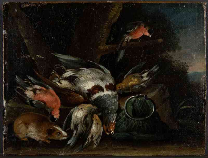 Das Jagdstillleben vereint vor angedeutetem Landschaftsausblick und einem Baumstamm verschiedene tote Vögel auf einem großen Steinblock: In der Mitte liegt an Rebhuhn, links erkennt man am hochroten Bauchgefieder einen Gimpel, von dem ein weiteres, lebendiges Exemplar rechts oben auf einem Ast des Baumes sitzt. Drei andere Singvögel, die nicht bestimmbar sind, ergänzen die Komposition, die von einem links unten kauernden Meerschweinchen und einer Jagdtasche mit Metallbügel rechts des Rebhuhns komplettiert wird. Das Gemälde zeichnet sich durch sein dunkeltoniges Kolorit und den bei der Wiedergabe der Tiere sehr detaillierten, im Rest jedoch flott und summarisch bleibenden Duktus der Malerei aus.