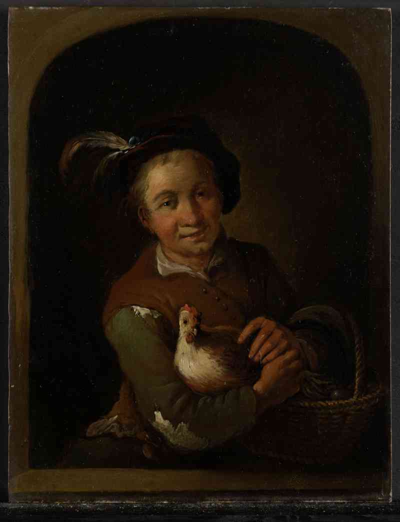 In einem Fenster mit korbbogenförmigem Abschluss erscheint ein junger Mann in halber Figur. Die leicht abgetragene Kleidung unterstreicht sein etwas derb-bäuerliches, im Grunde jedoch sympathisches Aussehen, das durch einen keck nach hinten gezogenen Hut abgerundet wird. Beide Arme vor der Brust verschränkt, hält er rechts einen Weidenkorb und links ein großes, weiß-braunes Huhn. Das Gemälde ist in feinmalerisch-glatter Malerei ausgeführt, und das von links oben einfallende Licht akzentuiert die Figur. Die charakteristische Gesichtsform und das brauntonig-gebrochene Kolorit lassen dabei an der Autorschaft Trautmanns keinen Zweifel.