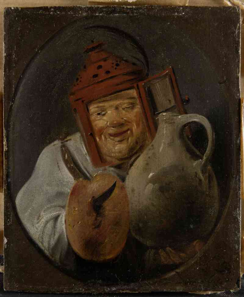 Karnevalsfigur mit Lampenhelm, Krug und aufgespießter Palette