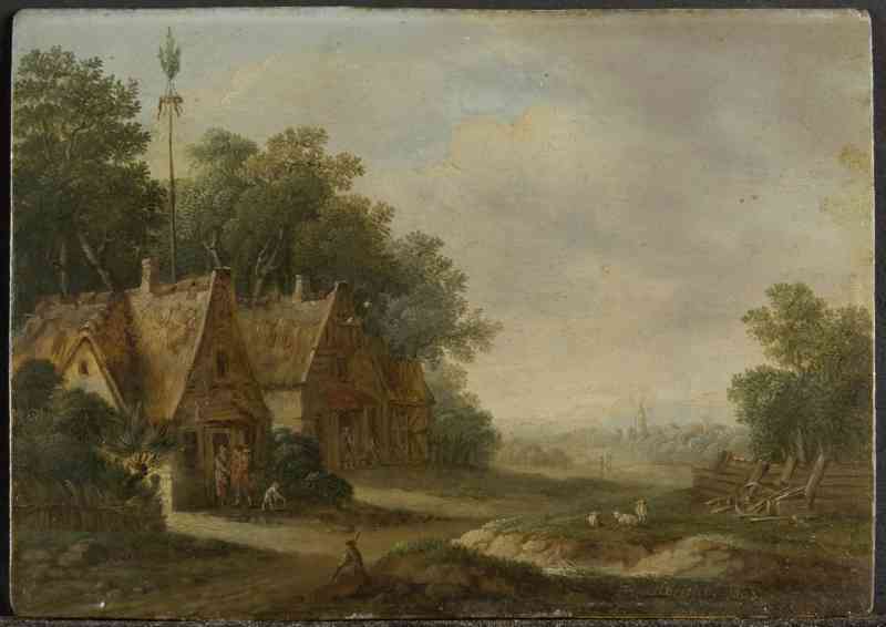 Die beiden Bildchen zeigen zwei Landschaften nach der Phantasie. In Pr435 führt ein Weg von links vorne nach rechts in den Hintergrund, wo ein Kirchturm zwischen Bäumen sowie dunstige Hügelketten zu erkennen sind. Links des Weges liegen zwei Häuser, deren Bewohner sich jeweils bei der Haustür tummeln. Rechts weiden drei Schafe auf einem kleinen Rasenstück. Ein zwischen den Häusern aufgepflanzter Maibaum bezeugt die lokalen Feste und Traditionen. Das Pendant Pr436 zeigt in gegenläufiger Komposition einen Fluss, der in die Tiefe und zu einer entfernten Ansiedlung mit Kirchturm links führt. Rechts erkennt man ein einzelnes bäuerliches Anwesen vor hohen Bäumen. Ein aus der Hand trinkender Junge mit Hund am Fluss sowie ein dahinter am Ufer sitzender Angler und eine Frau beleben die Darstellung.