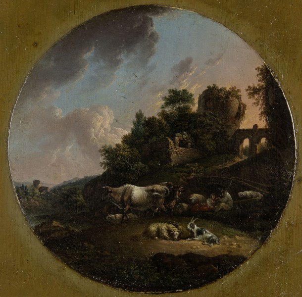 Eine arkadische Landschaft präsentiert sich in feinmalerischer Qualität in diesem Rundbild. Auf einer Bodenwelle im Vordergrund lagert ein dicht beieinander liegendes Hirtenpaar, von Rindern, Schafen und Ziegen umgeben. Rechts steigt hinter ihnen das Gelände zu einem Hügel an, auf dem eine Burgruine thront. Eine Brücke zwischen einem Turm und einem Bauteil am rechten Bildrand kündet noch von der einstigen Bauleistung. Der von Hellblau zu Rosa changierende Himmel ist von einigen großen Schönwetterwolken geziert.