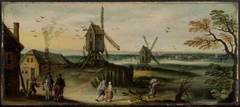 Als Vorlage für das Bildchen diente eine oft wiederholte Komposition von Jan Brueghel d. Ä. Das Urbild der Landschaft mit Windmühlen aus dem Jahr 1607, das die wesentlichen Bildmotive bereits besitzt, die Windmühlen aber etwas mehr von der Seite zeigt, befindet sich im Palazzo Spada in Rom. Der Prehn’sche Kopist ergänzte, um das länglichere Format zu füllen, das angeschnittene Haus links und einen lichten Baum rechts. Zugleich reduzierte er die im Vorbild breugheltypisch vielfigurige Staffage. Zusammen mit Pr670 stammt das vorliegende Bild vermutlich aus einem Antwerpener Kabinettschrank mit Landschaftsszenen.