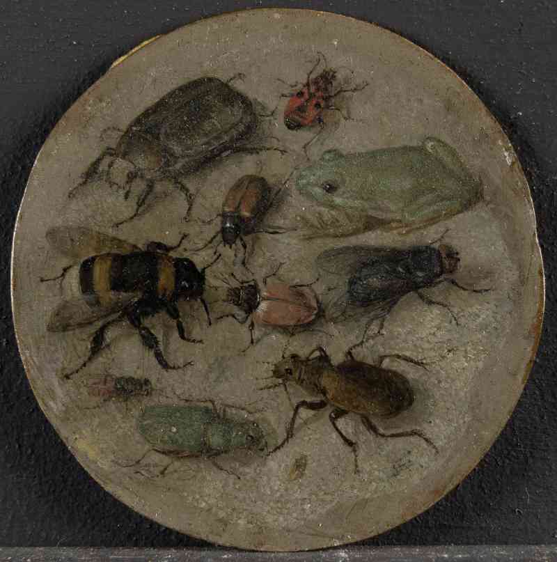 Auf dem grauen Grund verteilen sich elf Tiere und Insekten. Im Uhrzeigersinn rechts oben beginnend sehen wir einen hellgrünen Europäischen Laubfrosch. Sein charakteristischer dunkler Streifen, der sich von den Nasenlöchern über die Augen seitlich bis zur Hüfte erstreckt, ist aufgrund der Verputzungen kaum mehr zu erahnen. Es folgt eine Blaue Schmeißfliege, die im Gegensatz zur metallisch-goldgrün schillernden Goldfliege schwarzblau glänzt. Der kupferfarbene Kleine Puppenräuber ist an seinem auffälligen Halsschild zu erkennen. Das winzige Lebewesen am unteren Rand ist so stark verputzt, dass es sich nicht bestimmen lässt. Es folgt im ansteigenden Rund ein Feldsandläufer, der sich durch seine grüne Färbung und vor allem durch die zwei weißlich-gelben Punkte auf den Deckflügeln auszeichnet. An ihrem leuchtend roten Hinterteil ist die Gemeine Goldwespe oder Feuer-Goldwespe zu benennen. Über ihr steht riesig die Dunkle Erdhummel auf dem Untergrund. Der große Käfer am oberen Rand kann als Goldkäfer identifiziert werden. Eine Gemeine Feuerwanze, die hier im äußeren Rund den Brückenschlag zum Frosch macht, setzt mit ihrem auffällig rot-schwarz gemusterten Rückenschild den farbstärksten Akzent im Bild. Im Zentrum des Kreises sehen wir den Gartenlaubkäfer sowie darunter ein Pappel- oder Weidenblattkäfer. Wie bei allen anderen Flegel’schen Insekten- und Tiertäfelchen der Sammlung Prehn – außer den Seidenraupen-Verwandlungsbildern – sind auch hier die natürlichen Größenverhältnisse nicht eingehalten. Inhaltlich erscheint die Zusammenstellung wahllos.
