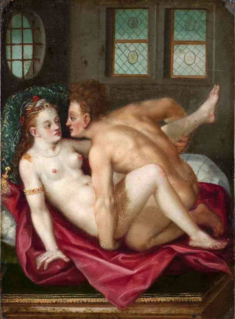 Eines der außergewöhnlichsten Bilder im Prehn’schen Kabinett ist diese Darstellung eines „Verliebten Gegenstandes“ (so der Titel im Auktionskatalog 1829). Die Wiedergabe nackter Figuren im Liebesspiel war in der Regel den Götterliebschaften vorbehalten. Um 1524 stach Marcantonio Raimondi (um 1475?–um 1534) nach Zeichnungen von Giulio Romano (1499–1546) die aufsehenerregende Kupferstichserie „I modi“ (dt. Die Stellungen), die erstmals Paare in den verschiedenen Posen des Liebesaktes vorstellte, die ganz irdischer und nicht göttlicher Abstammung waren. Die durch keinerlei Attribute gekennzeichneten Liebenden zeigten sich in sechzehn eindeutigen Stellungen – in einer zweiten Auflage zudem begleitet von pikanten Sonetten Pietro Aretinos (1492–1556). Von Papst Clemens VII. sofort verboten, wurden die Abzüge und Druckplatten zerstört, der Stecher Raimondi ins Gefängnis geworfen. Von den originalen Drucken haben sich nur wenige zerschnittene Fragmente erhalten. Ein einziger Raubdruck des frühen 16. Jahrhunderts existiert und zeigt die gesamte Folge. Die Stellung des Paares im Prehn’schen Bild erscheint hier als Liebespose Nr. 2.