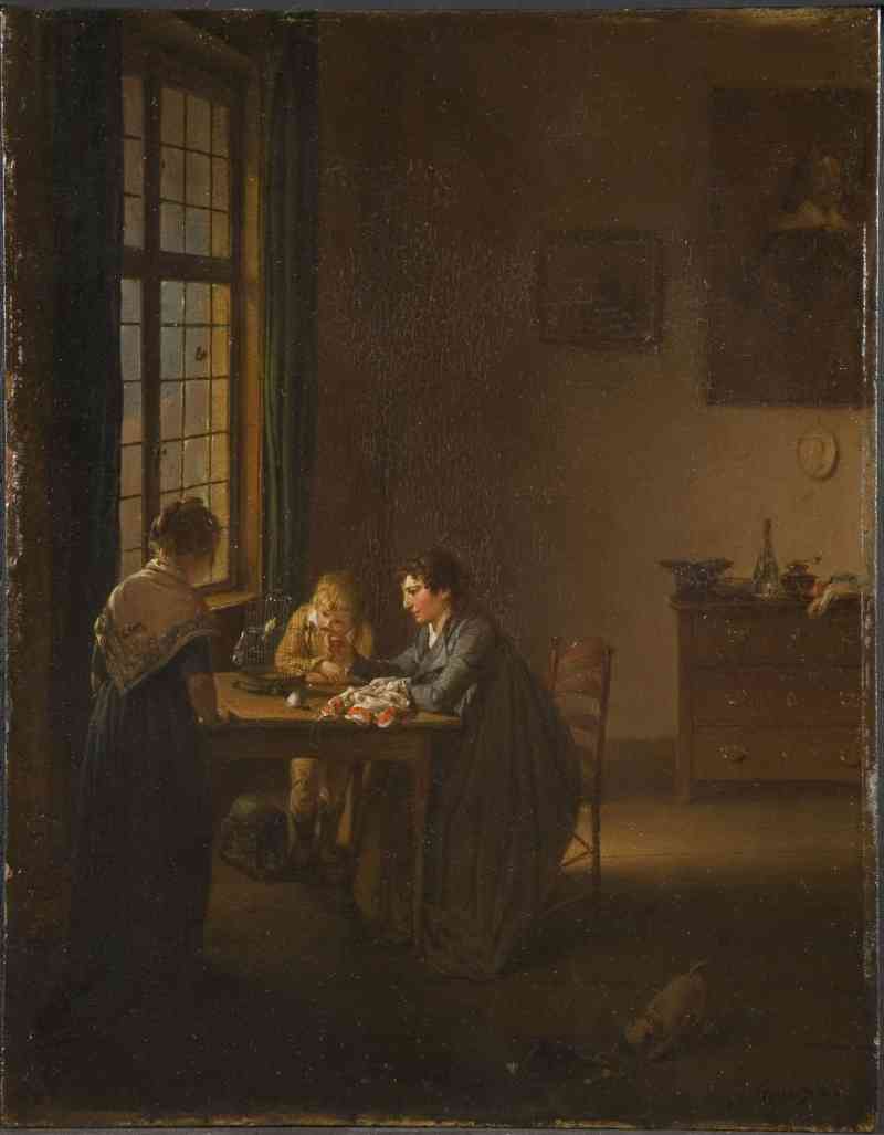 Mit den signierten und 1803 datierten Gemälden präsentiert uns Georg Karl Urlaub (1749–1811) zwei zeitgenössische genrehafte Interieurszenen, die sowohl in Format und Komposition, als auch inhaltlich aufeinander abgestimmt sind. Wie es häufiger bei ihm vorkommt, kombiniert der Künstler hier Szenen aus unterschiedlichen gesellschaftlichen Schichten: Das herrschaftliche Zimmer einer möglicherweise adligen Dame mit ihrer Kammerjungfer steht einer bürgerlichen Stube mit einer Mutter und ihren beiden Kindern gegenüber. Das verbindende Motiv ist der Vogel- beziehungsweise Tierkäfig, der zum Spiegel gegensätzlicher zwischenmenschlicher Beziehungen wird: Während er im einen Bild von der ganz in ihr eigenes Spiegelbild vertieften Dame nicht beachtet wird, ist er im Gegenstück das Zentrum des Interesses und Gegenstand eines gemeinsamen Gespräches. Distanziertheit und Isolierung in der gehobenen Schicht kontrastiert Urlaub hier mit einer bürgerlich-familiären Geborgenheit.