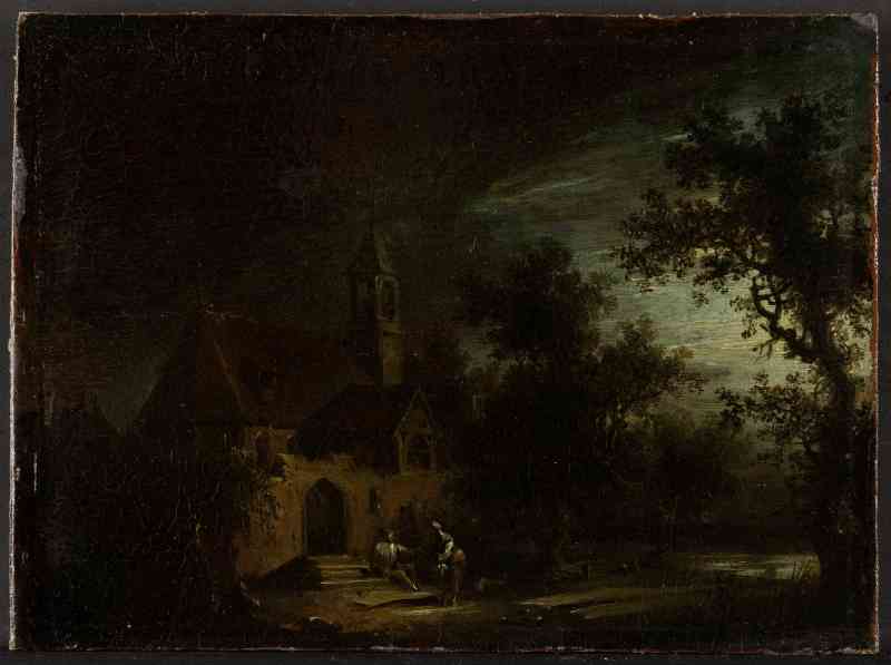 Die Darstellung zeigt eine Nachtlandschaft bei Mondschein, rechts gerahmt von einem hohen Baum, der silhouettenartig vor dem Mond als einzige Lichtquelle steht. Im Mittelgrund erkennt man ganz links die geduckten Häuser eines kleinen Dorfes sowie recht daneben eine Kirche. In der etwas ruinös erscheinenden Mauer der Anlage gewährt ein spitzbogiges Portal den Zutritt, auf dessen Stufen sich ein Bettler niedergelassen hat. Er fleht die Frau rechts daneben um eine Gabe an, während ein Hund in der Nähe umher streunt. Zwei weitere Vagabunden im Hintergrund runden die genrehafte Figurenstaffage ab.