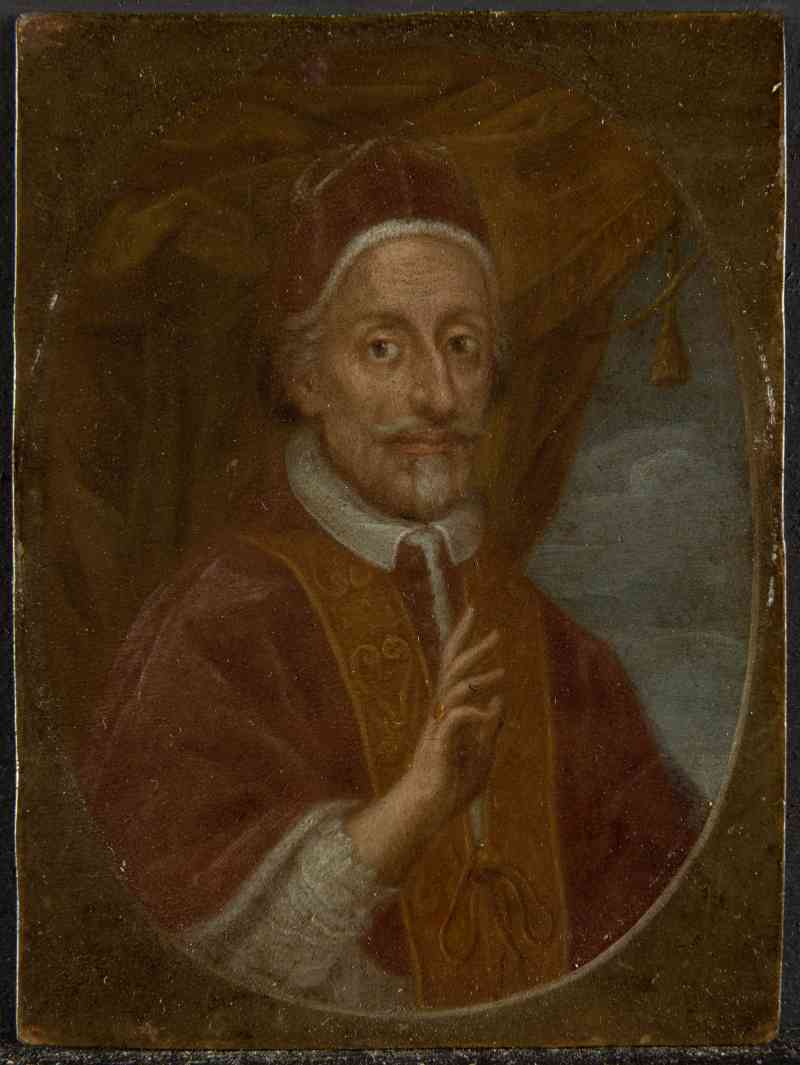 Das in einen leicht perspektivisch gemalten ovalen Rahmen eingepasste Bildnis zeigt Papst Innozenz XI. als Halbfigur, dessen Gesicht und Blick auf den Betrachter gerichtet sind. Innozenz XI., mit bürgerlichem Namen Benedetto Odelscalchi (1611–1689), stammte aus einer reichen Kaufmannsfamilie in Como und wurde 1676 zum Papst gewählt. Er hatte dieses Amt über 12 Jahre inne und gilt als einer der größten Päpste des 17. Jahrhunderts. Die bescheidene, anspruchslose und asketische Lebensweise, die er schon als Kardinal gepflegt hatte, führte Innozenz während seines Pontifikates fort, so dass er bereits zu Lebzeiten als Heiliger angesehen und unter Clemens XI. (1700–1721) der Kanonisationsprozess eingeleitet wurde.