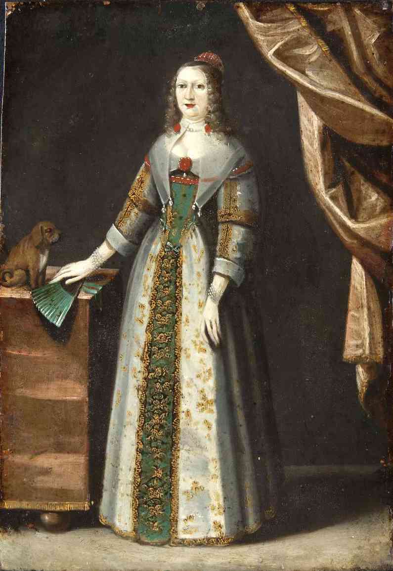 Die Dame mittleren Alters ist sehr farbenfroh gekleidet. Über einem dunkelgrünen Unterkleid mit Goldbrokatstickerei trägt sie ein weißes, ebenfalls mit goldenen Blumen verziertes Oberkleid mit Dreiviertelarm. Den Halsausschnitt säumt ein schmaler weißer Kragen. Ein doppelt gelegtes Tuch aus fast durchsichtigem Stoff (das sog. neerstick) bedeckt Schultern und Dekolletee. Die bis auf die Schultern herabfallenden Haare sind nur auf der Schädeldecke zurückgekämmt und am Hinterkopf unter einem roten Haarbeutel als Dutt zusammengenommen. Diese Frisur war um 1640/45 sehr in Mode, wie datierte Frauenbildnisse belegen. Der offenkundige Altersunterschied zwischen der Dame und dem jungen Mann des Pendantbildes macht es sehr unwahrscheinlich, dass es sich um ein Ehepaar handelt. Die Bilder stammen vermutlich auch von unterschiedlichen Künstlern.