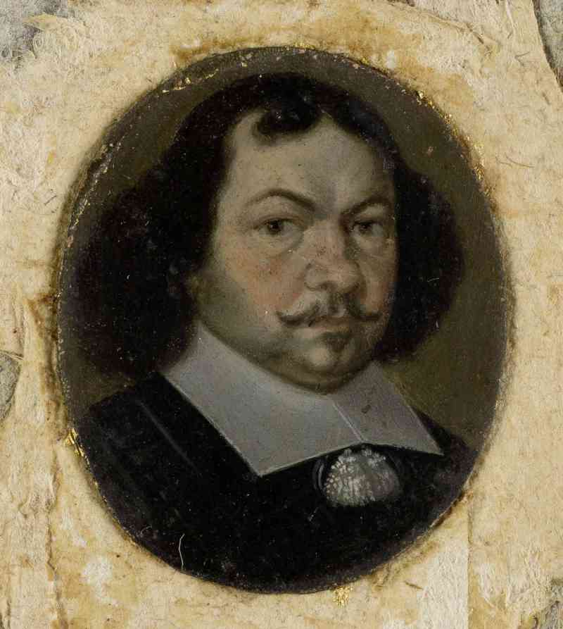 Der Mann reifen Alters trägt einen schwarzen Rock und darüber einen weißen Kragen, dessen Quastenschnüre unter dem Kragensaum hervorschauen. Das etwas fleischige Gesicht erhält durch den Oberlippenbart nebst dreieckigem Kinnbärtchen und durch die geschwungenen Augenbrauen eine elegante Note. Der Blick aus braunen Augen ist fest und energisch auf den Betrachter gerichtet. Sein Haarschnitt und die Kragenform verweisen auf die Mitte des 17. Jahrhunderts als Entstehungszeit des sehr fein gemalten Porträts.