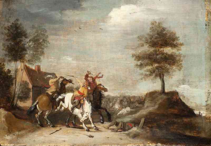 Die Verbindung von Pr426 mit Esaias van de Velde (um 1591–1639), wie Ernst Friedrich Carl Prehn und Passavant sie vorschlagen, ist nicht abwegig. Er war der erste nordniederländische Maler von Reitergefechten, die sich im 2. Viertel des 17. Jahrhunderts hier als Bildthema etablierten. Die Einzelformen von Pr426 haben jedoch keinerlei Bezug zu van de Velde, sondern verweisen eher auf den Einfluss des Flamen David Teniers d. J. (1610–1690).
