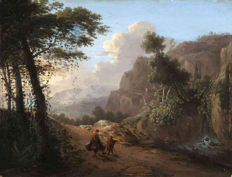 Wie Pr447 wird auch bei Pr448 der Eindruck einer südlichen Atmosphäre durch das milde Sonnenlicht bestimmt, das hier allerdings weitere Teile der Landschaft erfasst und durch eine rötlichere Färbung der Wolken am Horizont etwas abendlicher wirkt. Aus der Tiefe einer hügeligen Fernlandschaft führt ein breiter Weg diagonal in den rechten Vordergrund. Wiederum sind zwei Personen zu sehen: Ein in kräftigem Rot und Blau gekleideter Reisender auf seinem bepackten Maultier lässt sich von einer zerlumpten Gestalt mit Hut und Stock den Weg weisen.