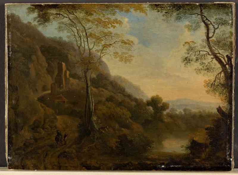 Die gesamte linke Bildhälfte wird von einem bewaldeten Berghang eingenommen, den sich ein direkt aus dem Vordergrund kommender Fahrweg hinaufschlängelt. Ein Reiter und ein Fußgänger bewegen sich auf ihn in Richtung eines Wohnhauses und einer dahinter liegenden Turmruine. Der abfallende Hang mündet rechts in einen Fluss oder See. Landschaft und Wolken sind von südlichem, goldenem Licht überzogen. Der unbekannte Künstler rekurriert damit auf die lichtdurchfluteten südlichen Landschaften, wie sie die dritte Generation der in Italien tätigen niederländischen und flämischen Maler schuf.