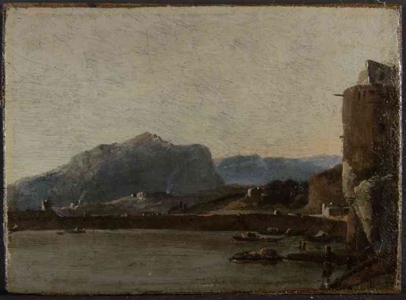 Abendlich graue Stimmung liegt über der südlichen Küstenszene, die sich vor einer Bergkette ausbreitet. Rechts erhebt sich ein ruinöser Turm, der vermutlich zu der Festungsmauer gehört, die sich über die ganze Breite des Bildes am Wasser entlangzieht. Einige wenige Barken dümpeln vor diesem in der See. Eine ausgesprochen ruhige und stille Atmosphäre charakterisiert dieses Landschaftsbild, die sich in der beschränkten und gedämpften Farbpalette spiegelt.