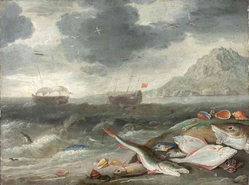 Kurz nach der Mitte des 17. Jahrhunderts entwickelte sich in der flämischen Kunst eine besondere Art des Fischstilllebens, bei dem die Tiere nicht in einem Innenraum sondern am Strand oder am Ufer eines Flusses liegend wiedergeben sind. Wie von den Wellen selbst hier angespült, zeigen sie den unermesslichen Reichtum der Meere und Flüsse. Hauptmeister dieses Bildtyps war der in Antwerpen tätige Jan van Kessel d. Ä. Pr780 ist die Kopie nach einem nur wenig größeren, ebenfalls unsignierten Gemäldes von Kessel, das sich 1966 im Londoner Kunsthandel befand. Die Kopie verrät sich durch die unpräzise Darstellung der Tiere und Schneckengehäuse: Alle Fische haben gewissermaßen einen kuriosen „Überbiss“, der eine Plattfisch besitzt irrtümlich ein Auge auf seiner Bauchseite, der andere weist asymmetrische Flossen auf.