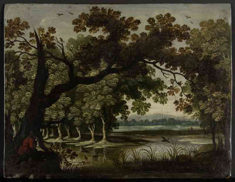 Als Vorbild für das Bildchen gilt eine Radierung von Matthäus Merian, der jedoch die Jäger-Staffage fehlt. Der handwerklich nur mittelmäßige Kopist, der sklavisch beinahe jedes einzelne Blattbüschel übernahm, war bei der Umsetzung der zusätzlich eingefügten Jägerfigur auf sich selbst gestellt und der Aufgabe nicht gewachsen. Aufgrund dieser malerischen Mängel ist die Kopie schwer zu datieren und einzuordnen. Die Arbeit wurde im Museum zeitweilig als deutsche Arbeit des 18. Jahrhunderts geführt. Das Kostüm des dargestellten Jägers scheint aber in den Anfang des 17. Jahrhunderts zu gehören und so lässt sich als Zeitangabe nur das Datum der Stichserie als terminus post quem nennen. Zu diesem passt allerdings auch das Motiv der Entenjagt, das sich auf zahlreichen Waldlandschaften findet.