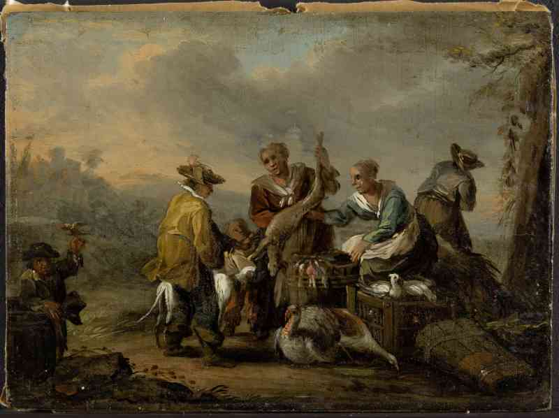 In einer jeweils in warmes Licht getauchten südlichen Landschaft zeigen die beiden Genrebildchen in der vorderen Bildebene locker gruppierte Marktszenen. Koloristisch überzeugen die Bilder durch ihre warme, ausgewogene Tonigkeit, die von kräftigen Farbakzenten in den Gewändern von Rot, Blau, Grün und Gelb durchbrochen wird. Prehn benannte den Künstler mit „H. Eisenbeck“, was alle nachfolgenden Autoren wiederholten. Jedoch wird der Künstler in der ersten Hälfte des 19. Jahrhunderts angesiedelt, was nicht mit der Datierung der Prehn’schen Bilder zusammenpasst. Diese stammen aufgrund ihres ganzen Erscheinungsbildes aus der zweiten Hälfte des 18. Jahrhunderts. Es gibt gute Gründe, in dem nirgends sonst auftauchenden „H. Eisenbeck“ einen Hör- bzw. Schreibfehler für den in Frankfurt belegten Maler Johann Heinrich Eisenbach zu vermuten. Dessen Lebenszeiten stimmen mit der Entstehungszeit der Bildchen überein, zudem gehören neben Historien auch kleinformatige Marktszenen zu seinem Repertoire.